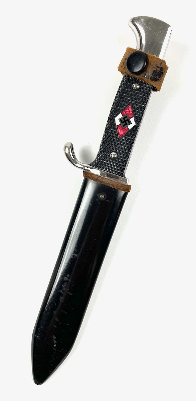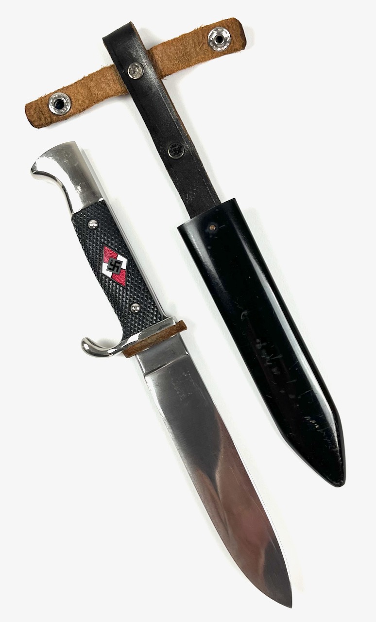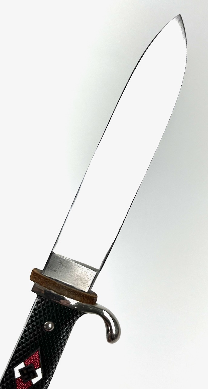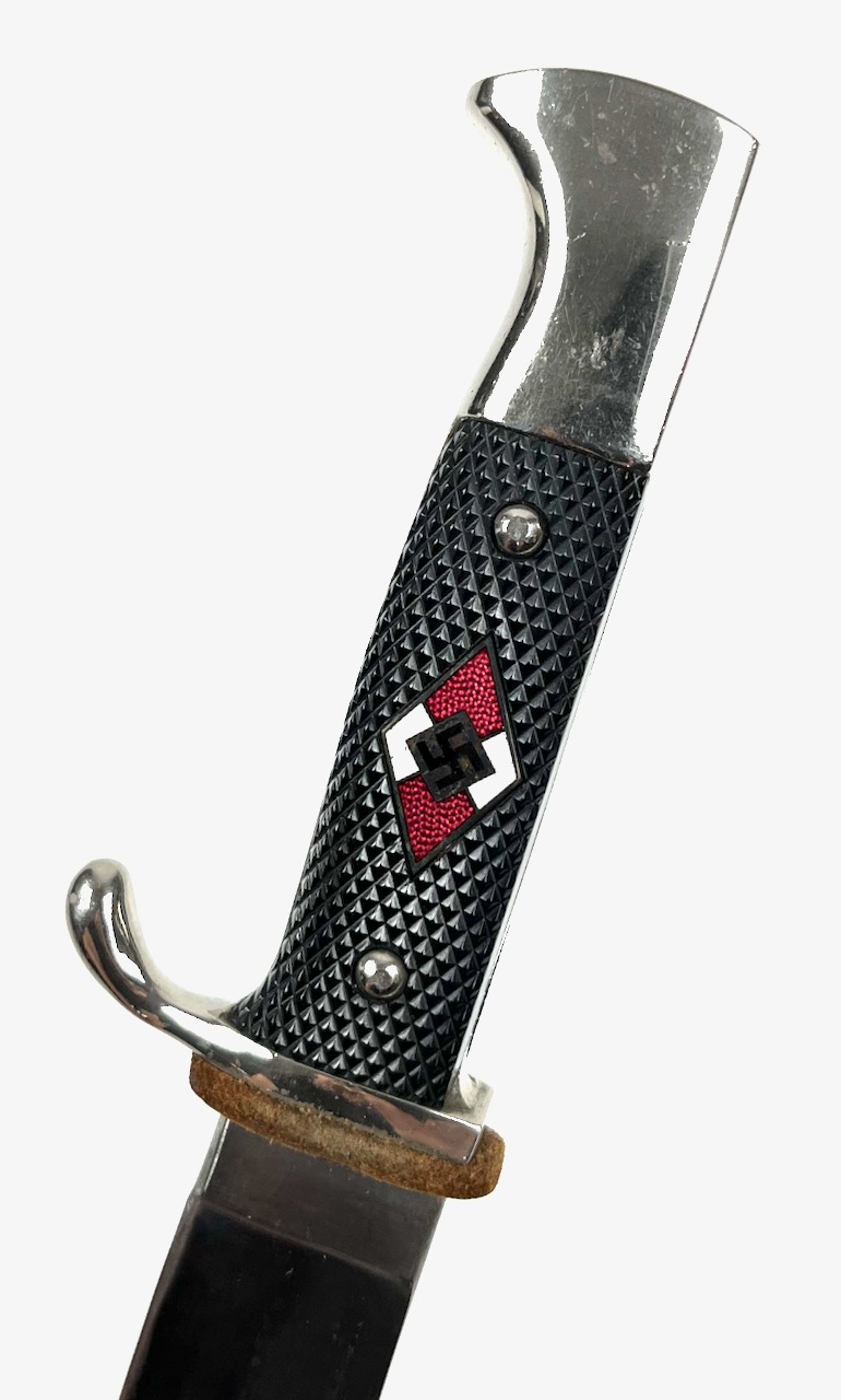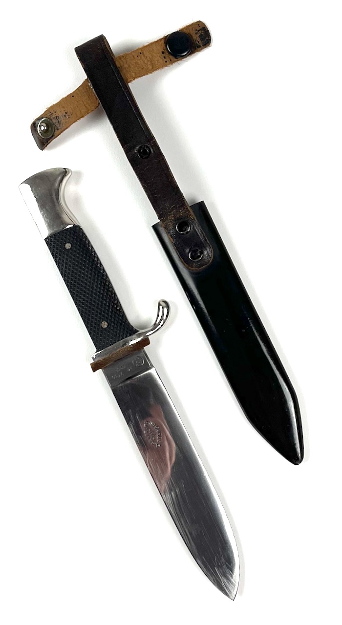 PHYSICAL DESCRIPTION: This Hitler Youth Dagger is in nice condition showing some light age. Blade is nice and bright showing some very light sharpening. Blade is RZM M7/72 marked at Ricasso for the Firm of Karl Rob. Kaldenbach of Solingen-Grafrath . Grips are nice with no chips or cracks. Pommel has a couple of tiny wear spots. Scabbard is nice with no dents. Leather hanger has been war time modified to swivel. Nice job. Scabbard has some wear towards tip but retains quite a bit of it's original paint. Overall a very nice dagger.