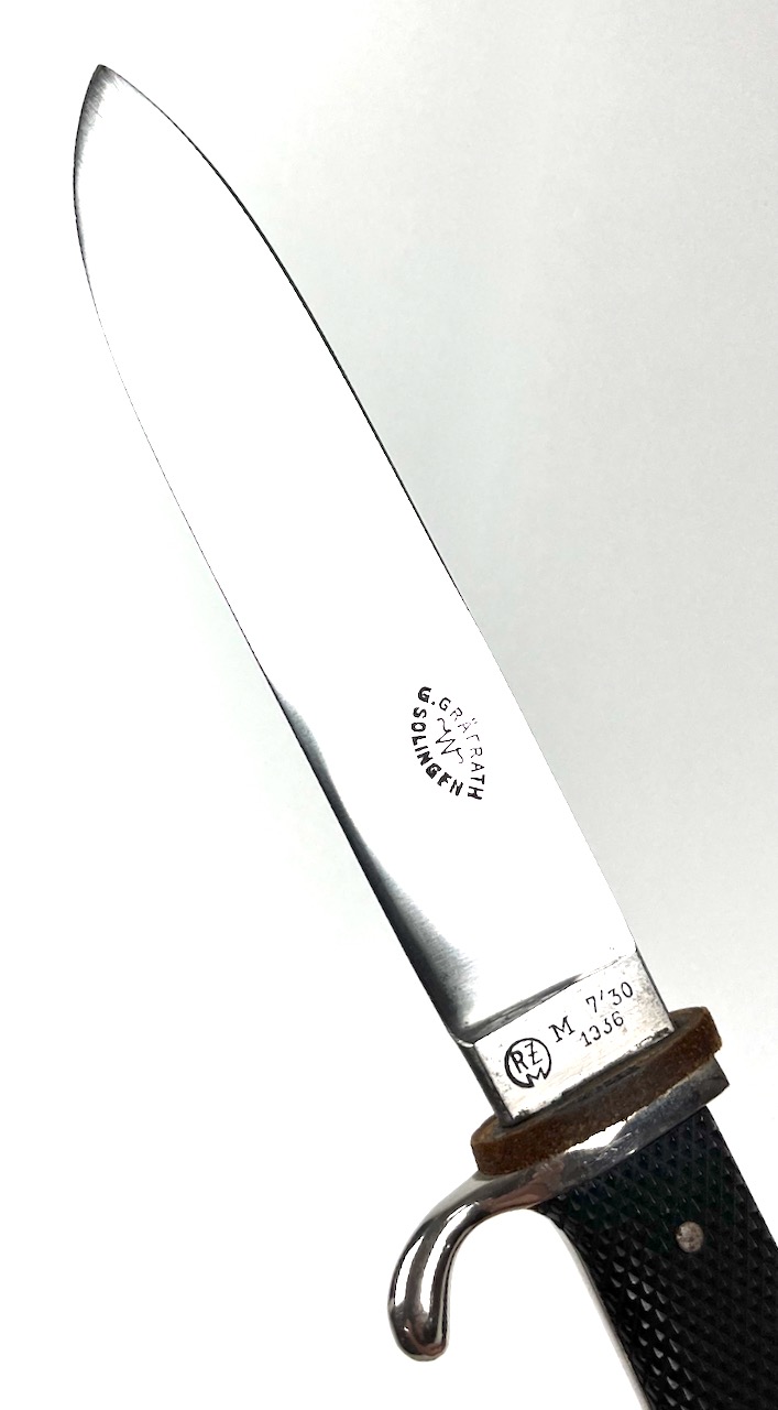 PHYSICAL DESCRIPTION: This Hitler Youth Knife is in real nice condition. Blade is still bright and unsharpened with no rust or spotting. Blade is maker marked G. Grafrath Solingen and RZM M 7/30 1936 at ricasso. Grips are perfect with no damage whatsoever. Grip diamond is real nice with no cracks or chips. Crossguard and pommel are bright with no bubbling to finish. Scabbard is nice retaining approximately 90 % of it's original paint. Leather hanger is nice and supple. Leather retaining strap is all there but it is very soft. Snap functions great.