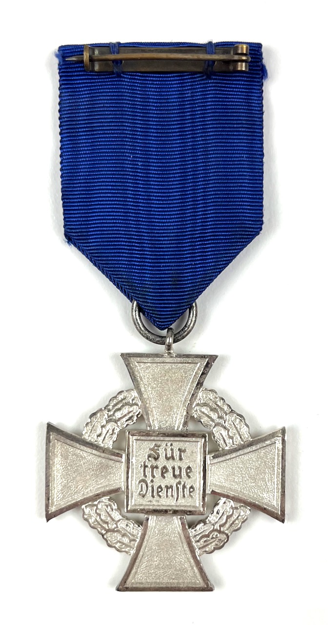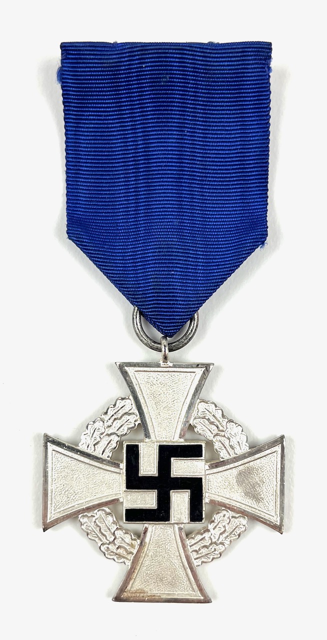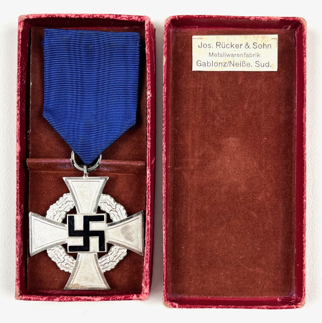 PHYSICAL DESCRIPTION: This German 25 Year Faithful Service Cross is in nice condition. Fastening pin is present and functions great. Box shows some wear and age. All corners are intact. Box is marked : Jos. Rucker & Sohn Metallwarenfabrik Gablonz/Neisse.Sud. .