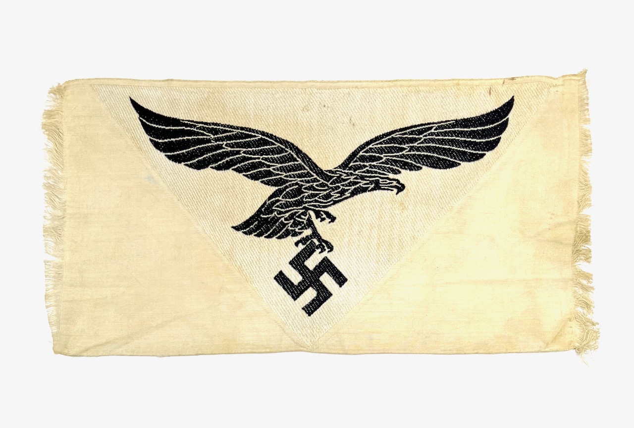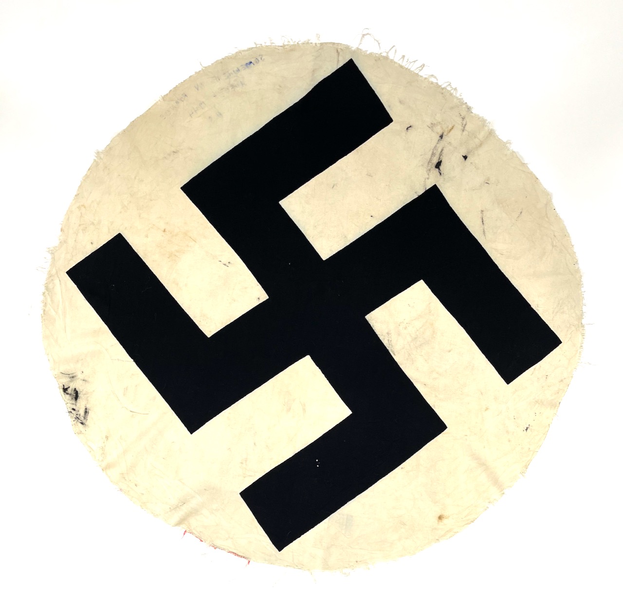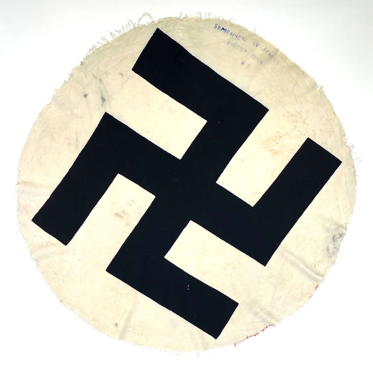PHYSICAL DESCRIPTION: This Swastika Portion of German Flag is in nice condition. This was obviously cut from the center of a flag. Edges are crudely cut with some soiling. G.I. has inked the edge : Somewhere in France August 1944 H.S. . Center portion of flag measures 35 inches across.